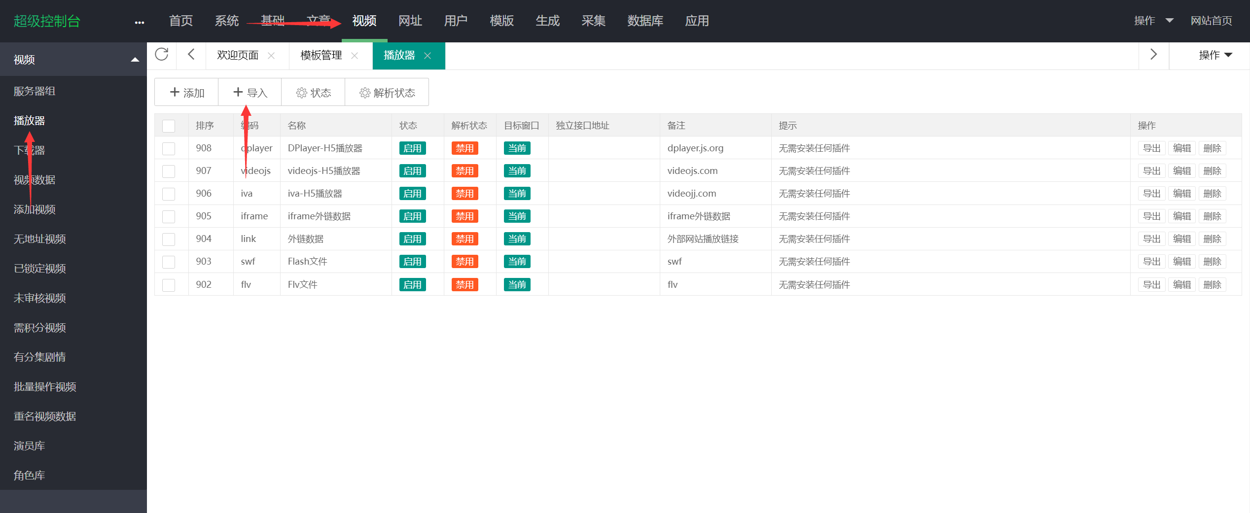 答:到官网下载播放器文件-CMS后台点击视频-播放器-导入-选择刚刚下载的播放器文件(txt)-保存,右上角清理缓存(执行任何操作建议都缓存一下)